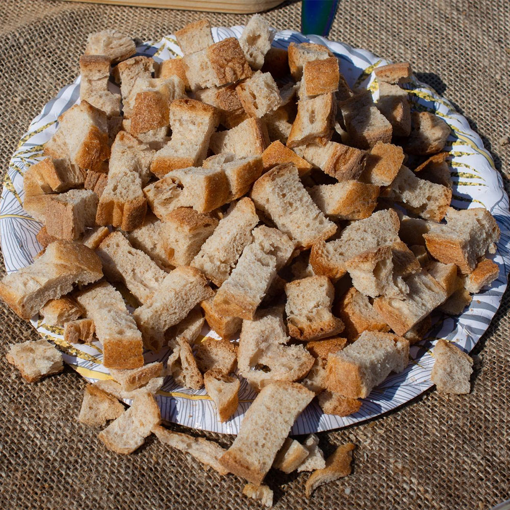 - Osušene i pečene jufke zdrobimo rukom i pomiješamo s usitnjenim pilećim mesom.